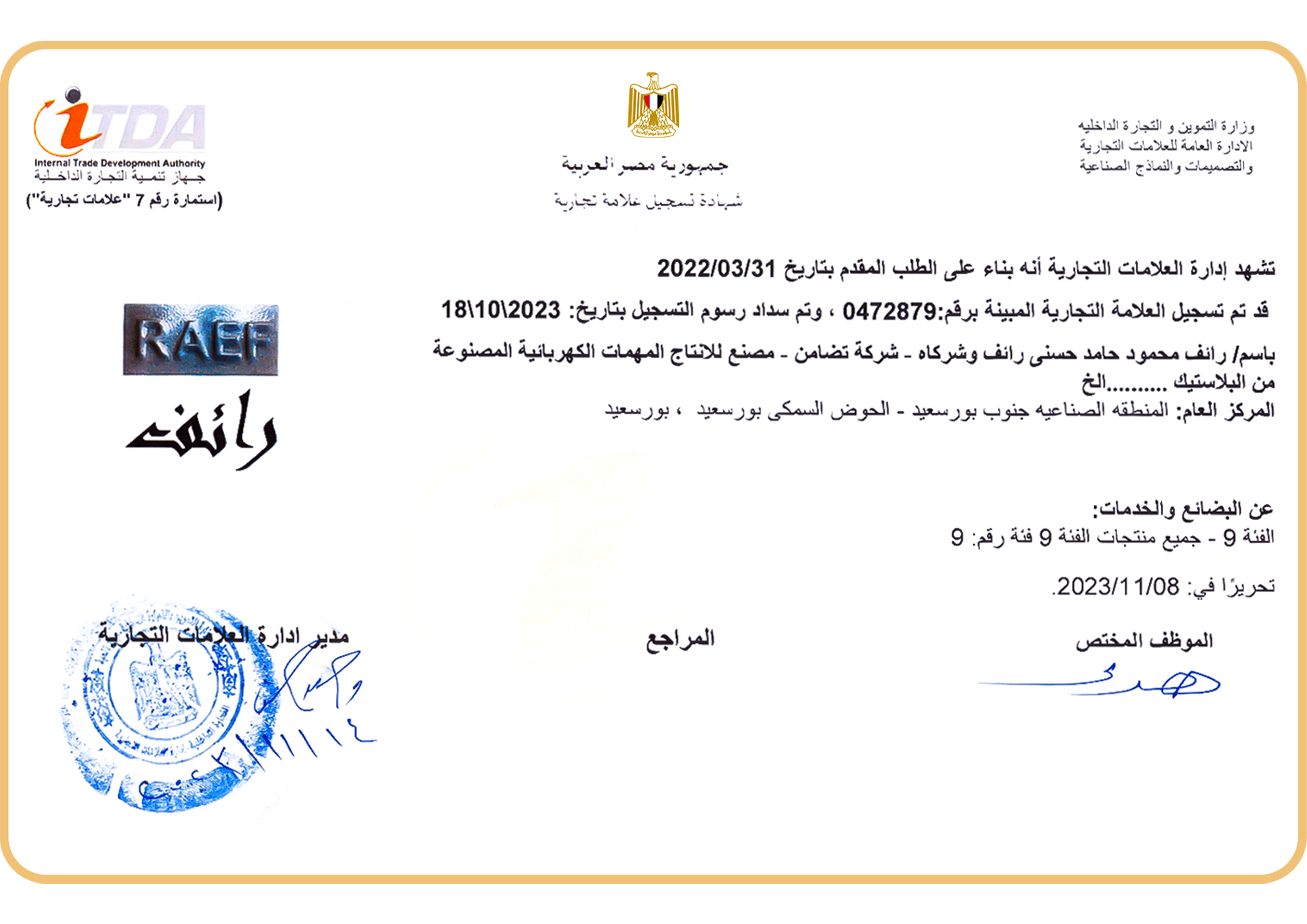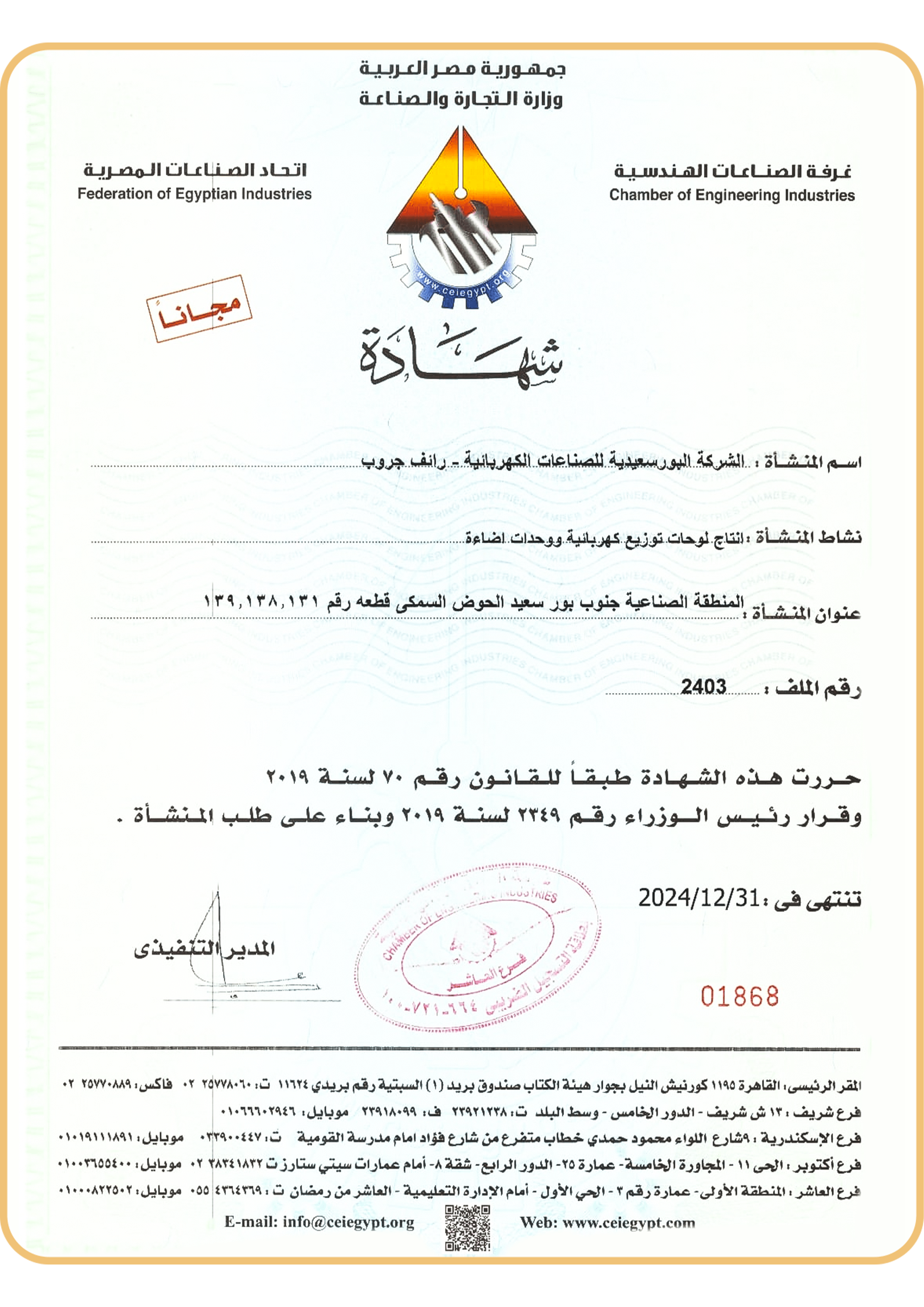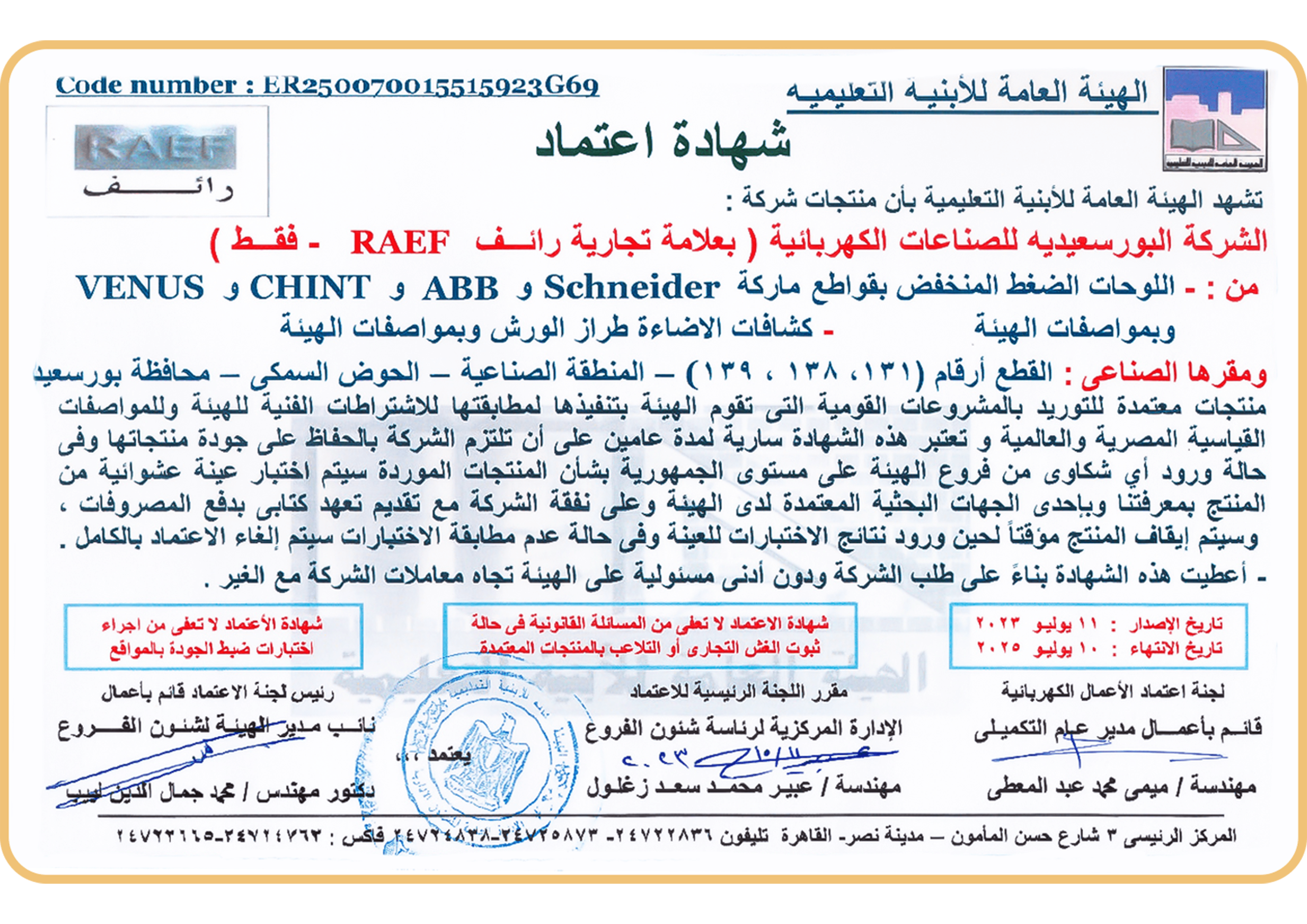 الشهادات الالتزام بالجودة في رائف جروب، ندرك جيدًا أهمية السلامة والجودة في قطاع الصناعات الكهربائية. ولهذا نحرص دائمًا على الالتزام بأعلى المعايير، ونفخر بحصولنا على شهادات اعتماد من أبرز الهيئات والمنظمات في هذا المجال. إرثنا